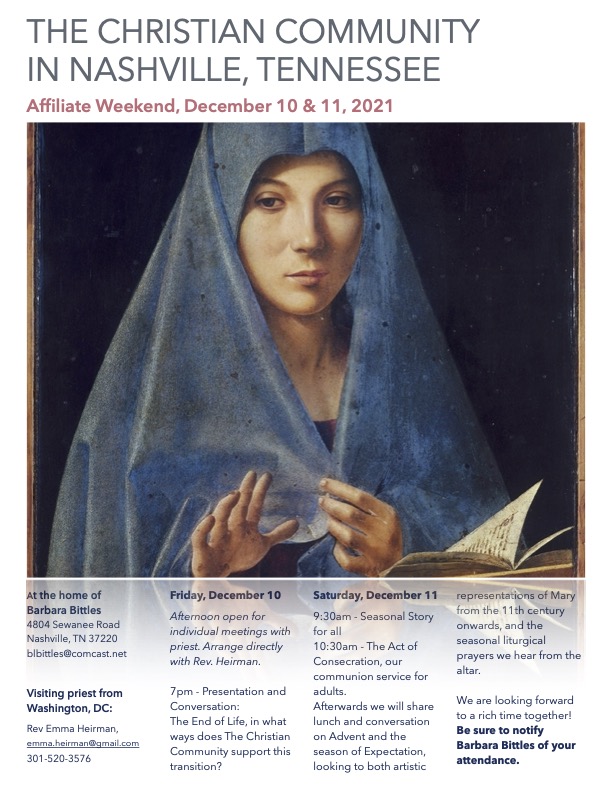 The Christian Community in Nashville presents Rev. Emma Heirman Dec 10 & 11